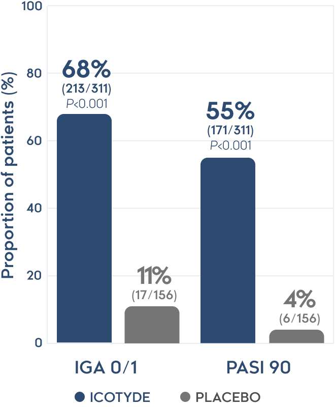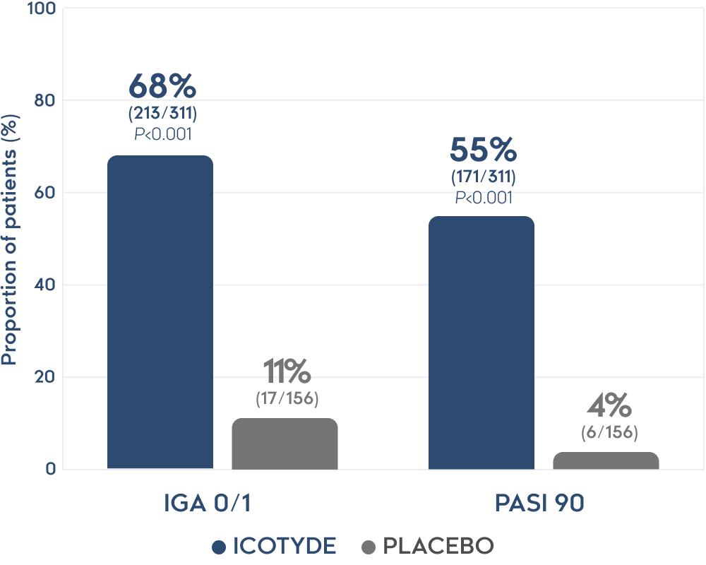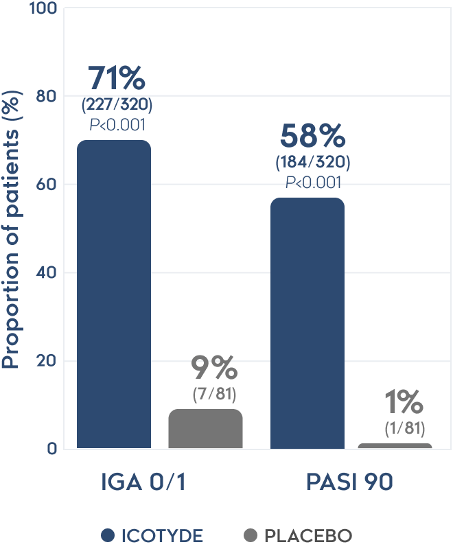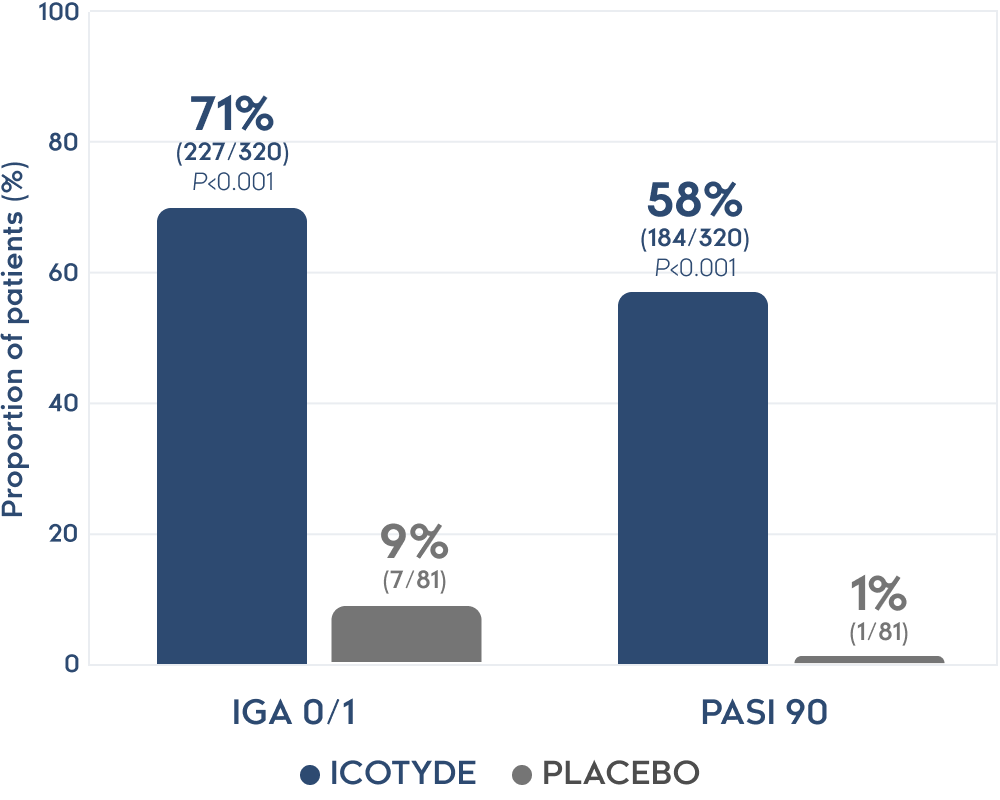 IGA 0 in ADVANCE 2 at Week 16: ICOTYDE 37% (118/320) vs placebo 1% (1/82), P<0.001; at Week 24, 40% (128/320) ICOTYDE vs 21% (68/322) active comparator (P<0.001)1,2*†